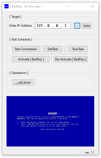 Реализация выглядит следующим образом, на компьютере пользователя размещается специальный файл (который при запуске вызывает BSOD) и создаётся задание в Планировщик задач Windows